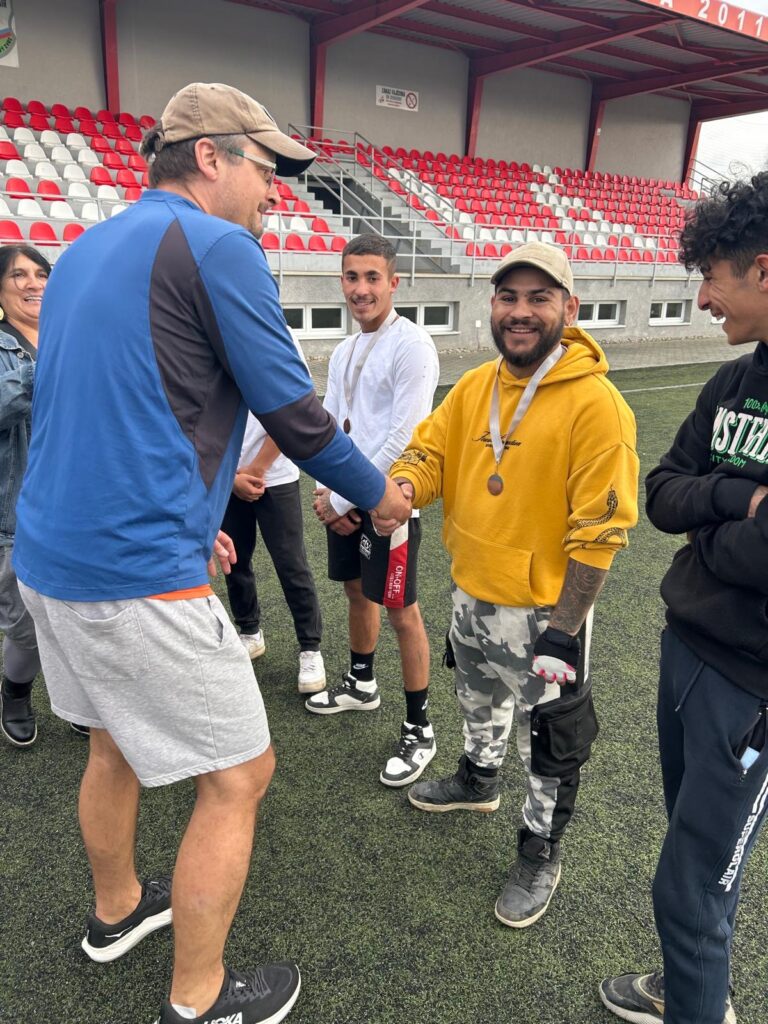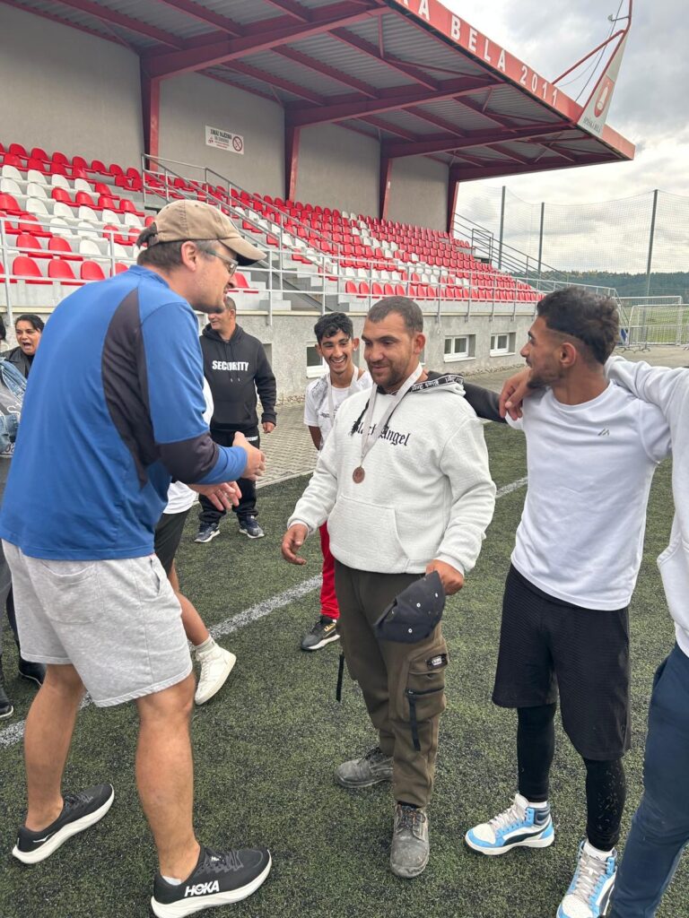 Rozhodli sme sa pre model 2 zápasov: prvý zápas v Rakúsoch (10.10.2025), odvetný v Krížovej Vsi (17.10.2025). V prípade rovnosti bodov by rozhodovalo vzájomné skóre strelených a obdržaných gólov. Nakoľko v Krížovej Vsi momentálne nemajú k dispozícii veľké futbalové ihrisko, odveta sa uskutočnila na štadióne v Spišskej Belej. Odborný pracovník Igor André bol rozhodca, manažérka projektu Alexandra Jendrichovská a druhá odborná pracovníčka Jana Beťková mali na starosti sledovanie skóre. Peer pracovníčky pripravili pre všetkých občerstvenie. Napokon oba zápasy vyhrala Krížová Ves a to pomerne jednoznačne – 6:2 v Rakúsoch a 6:1 v Spišskej Belej. Každý hráč z oboch tímov dostal od nás symbolické medaily: víťazi zlaté, porazení strieborné.
